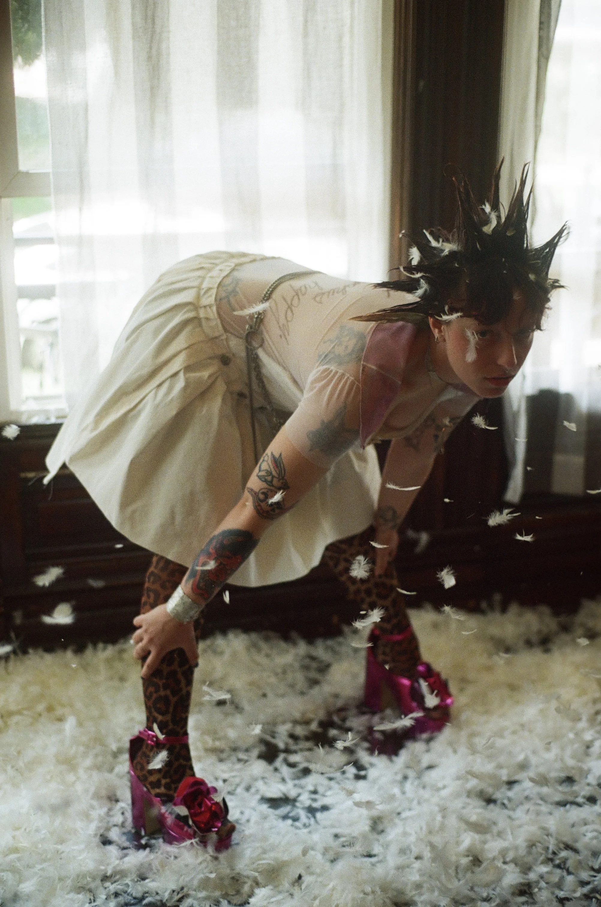 Hand-Printed Custom Dress made from Organic Cotton, Power Mesh, and Water-Resistant Fabric. Custom Belt from Zo Roze. Choker and Cuff from @camietz. Photography and Direction by Madeline Hansen. Assisted by Willa Irene. 2025.